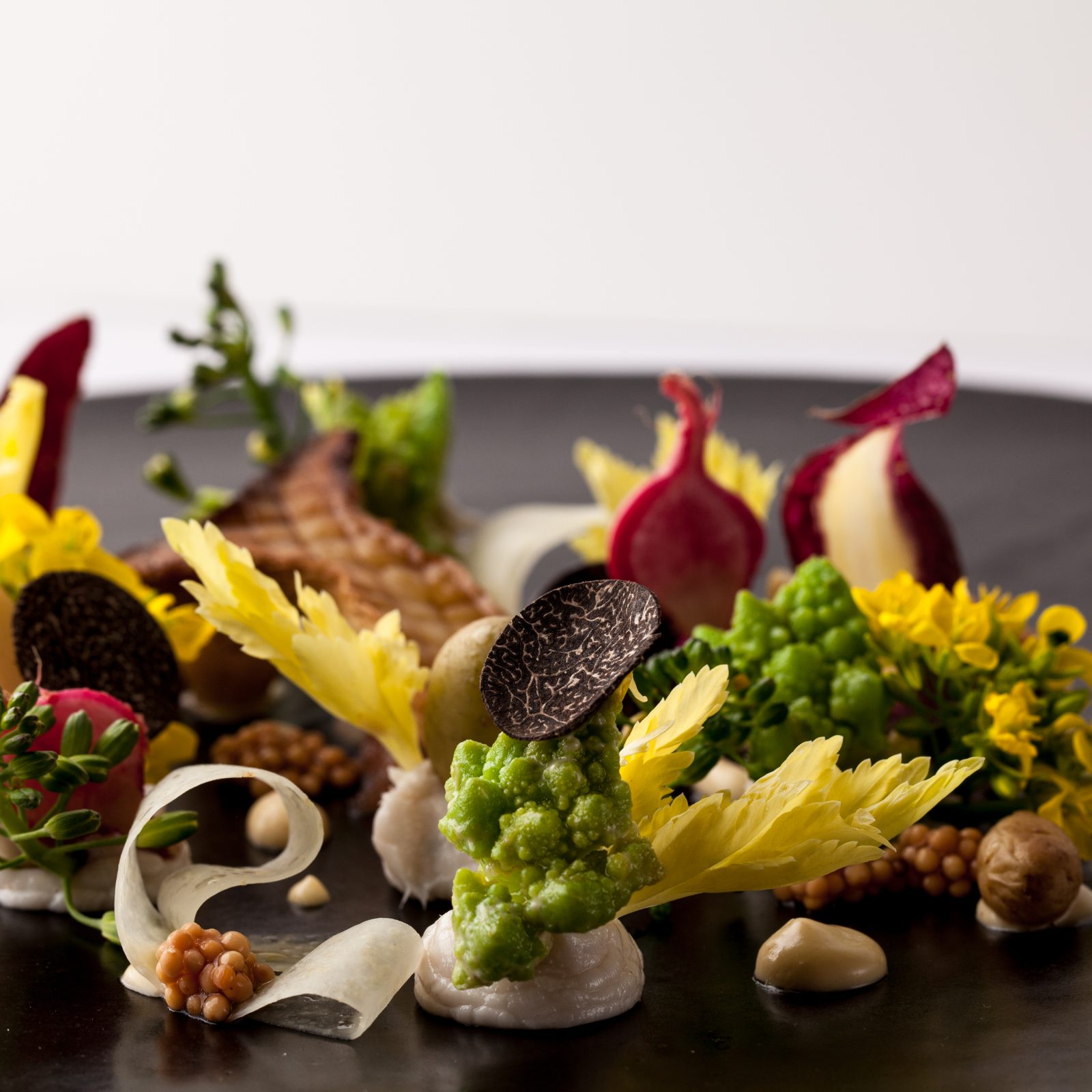 בקר רך בבישול איטי ברוטב יין אדום מוגש עם ירקות שורש צלויים.